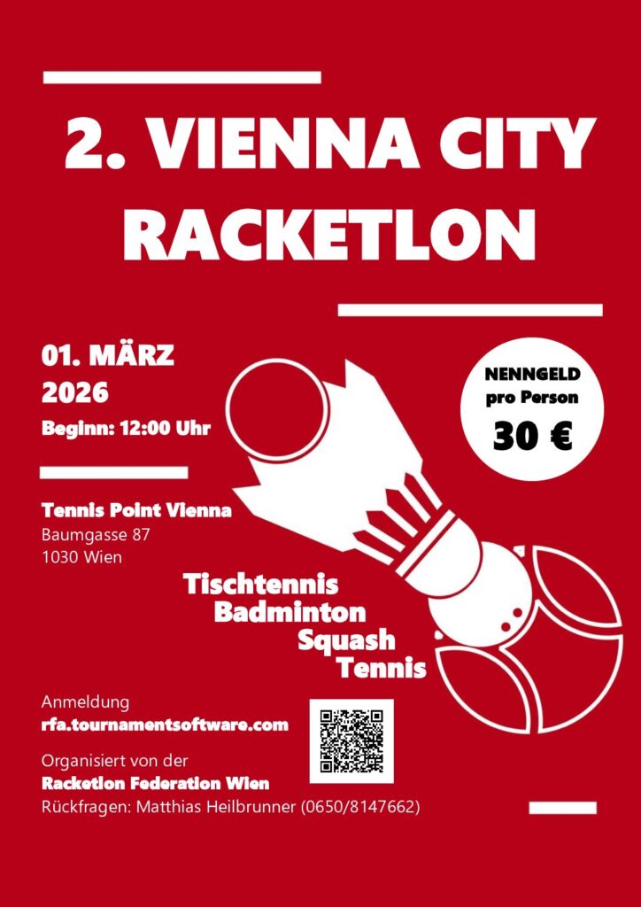 Die erste Station der RFA AUSTRIAN TOUR findet am 1.3.2026 unter der Obhut der Racketlon Federation Wien im Tennispoint Vienna, im 3.Wiener Bezirk statt. Das Team rund um den Wiener Präsidenten Matthias Heilbrunner freut sich auf die 2.Ausgabe des Vienna City Rackeltons. Spielbeginn ist ab 12:30 Uhr Uhr. Nennungen sind noch bis heute, Donnerstag den 26.2.2026, 23.59 Uhr möglich.